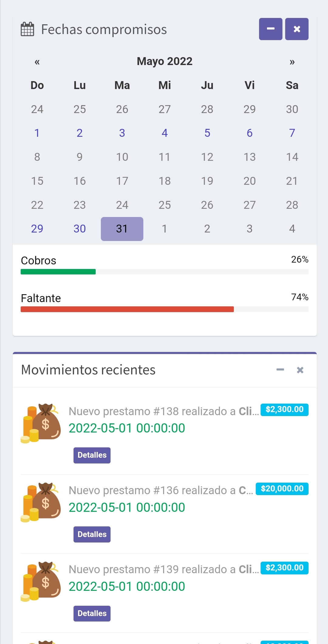 Ya no tienes que estar perdido con los cobros correspondientes al mes. Desde la pantalla principal puedes ver de un vistazo el calendario de cobros.